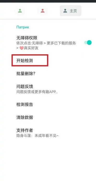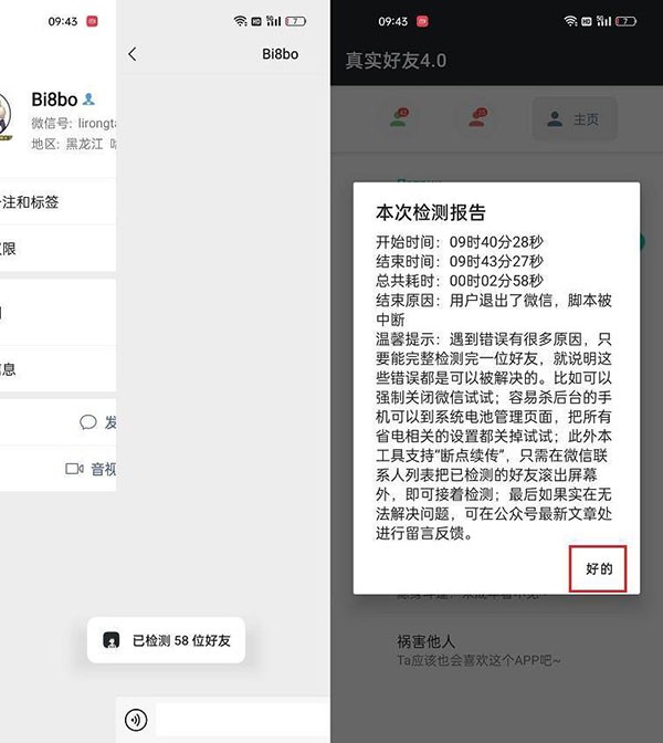 4、如果中途因不小心中断,可以再次使用真实好友APP进行开始检测。耐心等待检测完,或者用户手动终止后,返回真实好友4.0