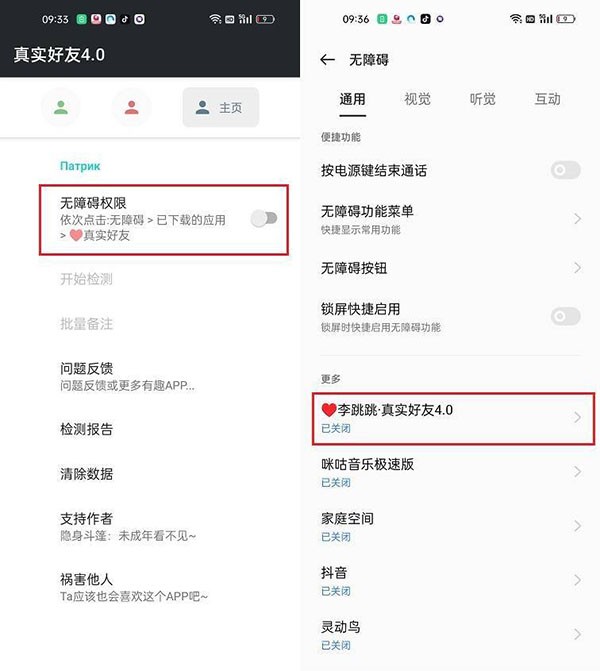 1、下载后打开软件,首次使用开启“无障碍权限”,点击无障碍权限后面的开关,之后再“已下载的应用”下找到并点击“李跳跳真实好友4.0”,并「允许」APP控制设备进行开启,如图所示。