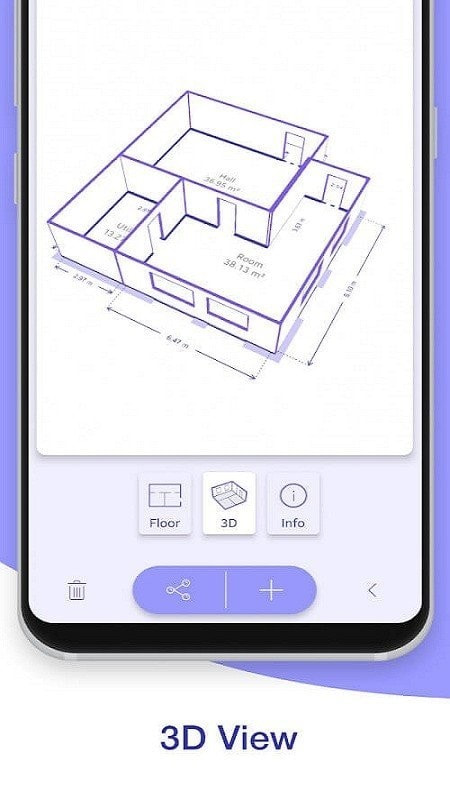 展示创建房间的三维地板平面以及所有测量所得的尺寸。