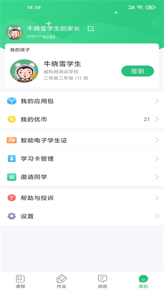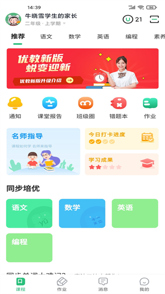 1、登录并访问主界面:首先,使用当前家长账号登录优教信使家辅版应用。