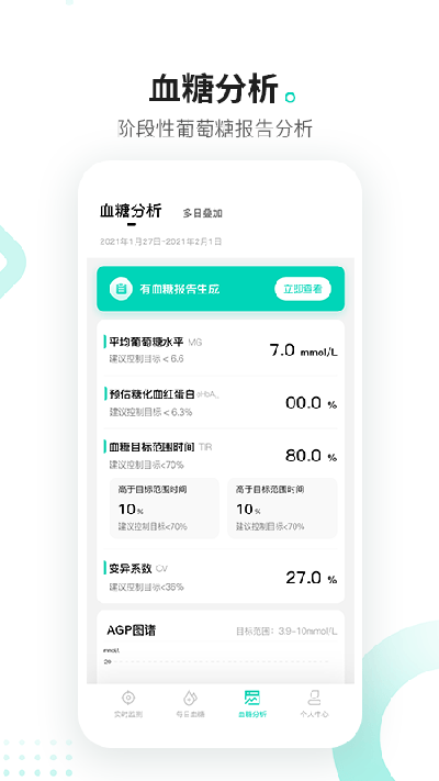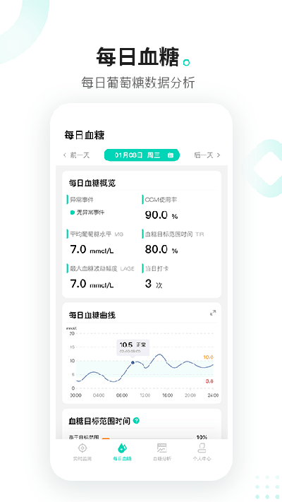 2. 软件能出色满足用户的设置需求,其主页清晰简约,用户可一目了然地查看血糖分析报表。