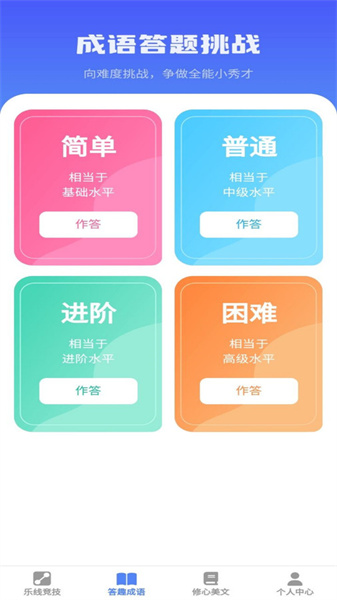 乐答安培是一款功能完备的成语知识答题软件,拥有海量知识题库。只需在线一键答题就能开启挑战,还提供诸多优质服务,趣味性十足。你可以随时挑选不同难度的题目作答,感兴趣的小伙伴们,快来体验一番吧。