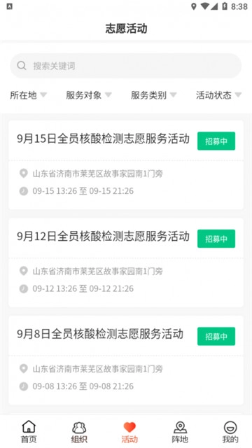 3、您可把导航栏切换至页面底部的【活动】,在打开的页面里,能够看到最新的志愿者活动以及周边的志愿者活动。