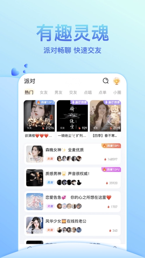 K歌,扩列,电竞,踢保,相亲海量娱乐派对,随时随地多人语音连麦畅聊,相亲房、情侣房、K歌房等的个性房间,等你来参与。