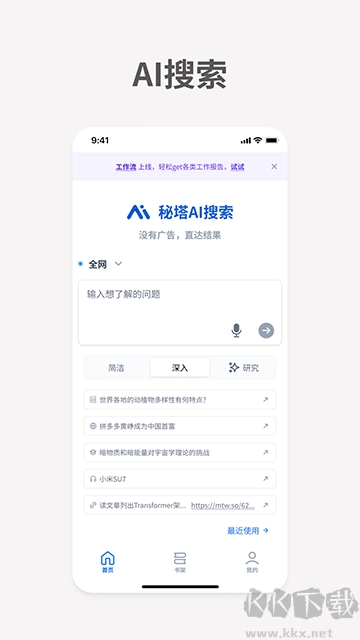 日常搜索er:秘塔AI搜索提供简洁/深入/研究三种搜索强度,以及全网/学术/文库/播客多种搜索范围,满足不同用户对信息检索的需求