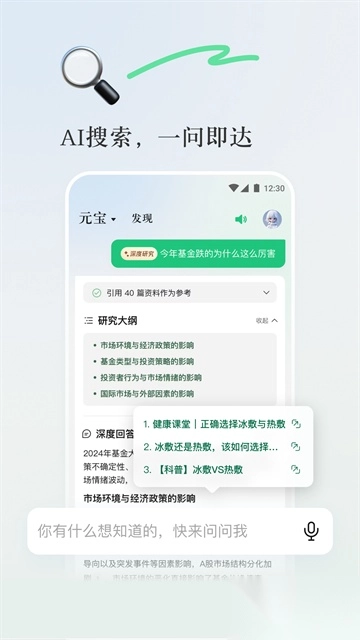 您能在任何时候与元宝展开对话,元宝凭借强大的模型及搜索能力,为您提供精准答案。无论是搜答案、找资料,还是寻求灵感,只需一问,即刻获取,让信息搜索变得更为轻松。