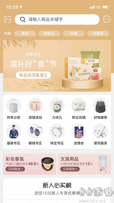 2. 在应用首页,可即刻查看所提供的搜索专区以及各类商品信息。