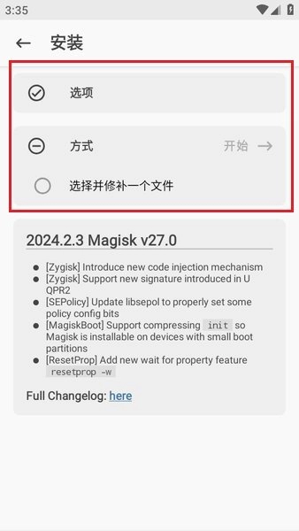 安装界面选项默认“安装到Recovery”,方式要求“选择并修补一个文件”;