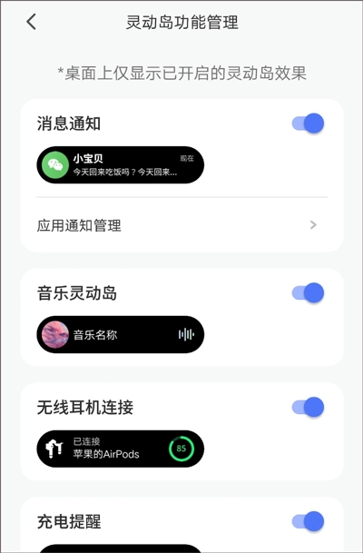 3、灵动岛管理具备多项功能效果,涵盖消息通知、音乐灵动岛、无线耳机连接以及充电提醒,用户可按需开启。