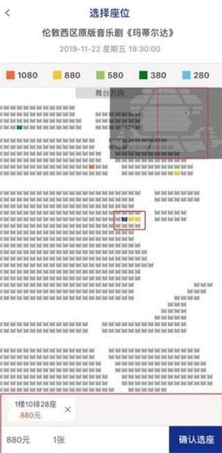 2、在确定好演出时间后,点击“选座购买”按钮进入座位选择界面,选好座位后再点击“确认选座”,即可进入订单确认页面。