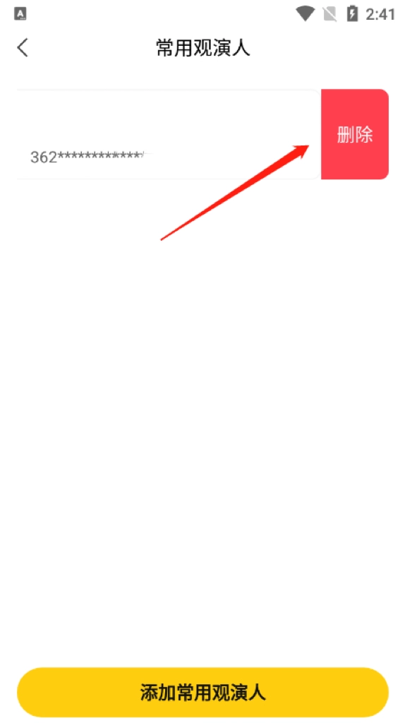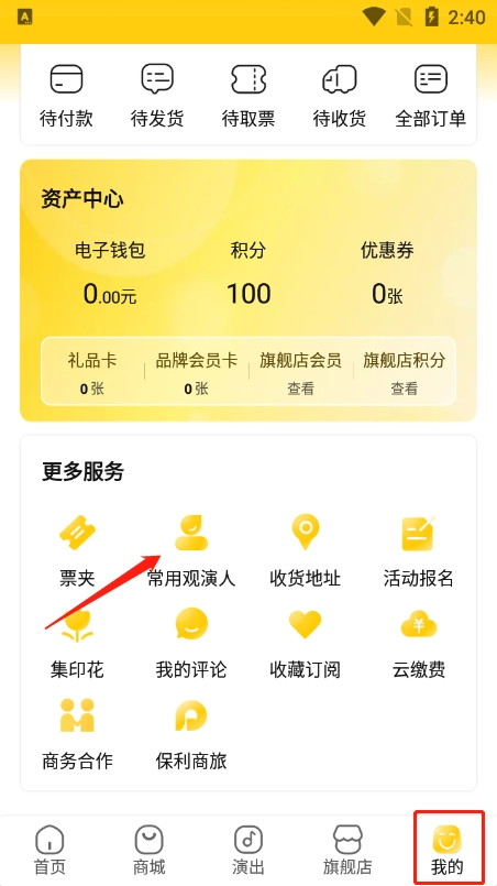 1、第一步,打开后点击底部功能栏里的【我的】,接着点击【常用观演人】;