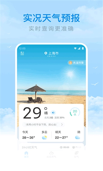 3、日出日落:以动态形式呈现日出与日落的时间,并提供空气质量、风力、风速等相关提醒信息。