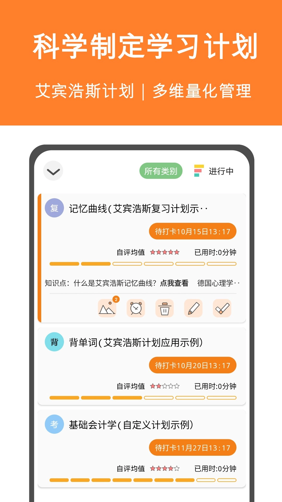 基于艾宾浩斯记忆法,可快速批量生成学习复习计划,助力自我提升效率、强化长久记忆。计划涵盖任务计时、自评、提醒等核心功能,搭配桌面小部件快捷打卡支持,让您能专注于计划执行本身。