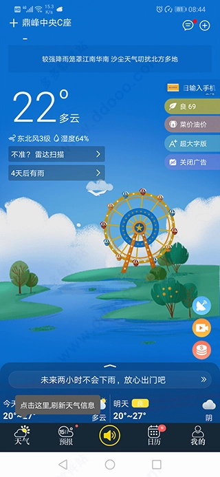 多看天气是一款智能天气小工具,能精准播报未来两小时的天气状况。阴晴雨雪、空气质量、穿衣建议、洗车指南、污染指数等各类信息,支持随时查询并会及时推送。有了它,天气变化尽在掌握,让你的出行更安心。