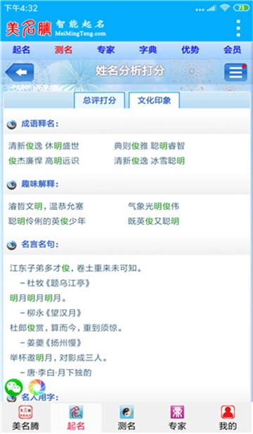 2. 姓名测试打分:配备专业的姓名评分体系,从音韵、字形、寓意等多个层面展开对名字的综合考量,力求筛选出的名字兼具悦耳的听觉感受与深厚的内涵意义。