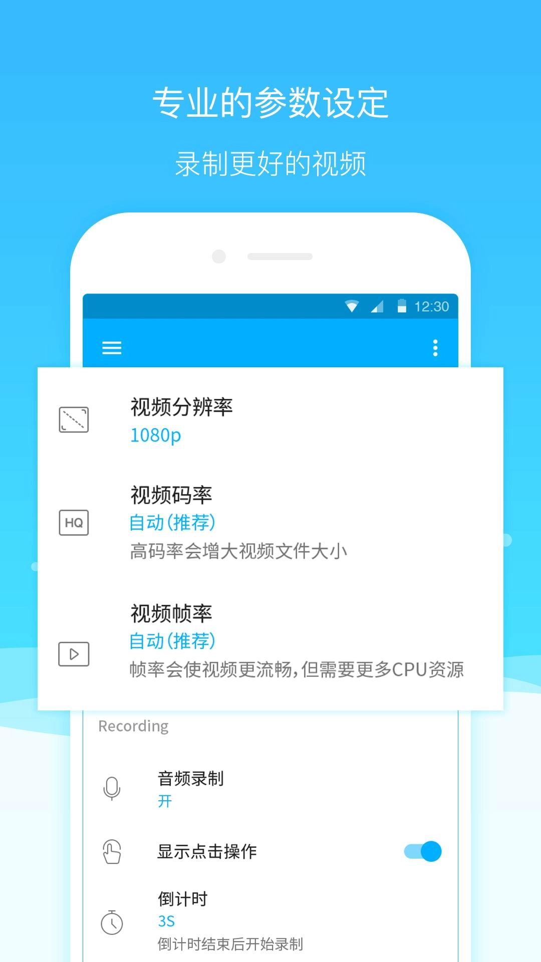 2.位于上方的三角形图标即为开始录制按钮,点击该按钮后系统会提供3秒的准备时间