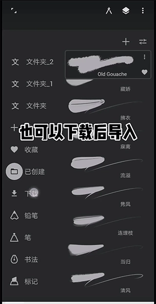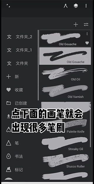 3、在当前页面挑选一支画笔,接着点击黑色区域右上角“+”号的附近位置,就能进入画笔的详细参数设置界面。