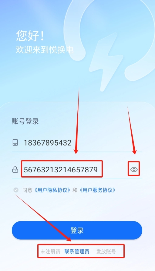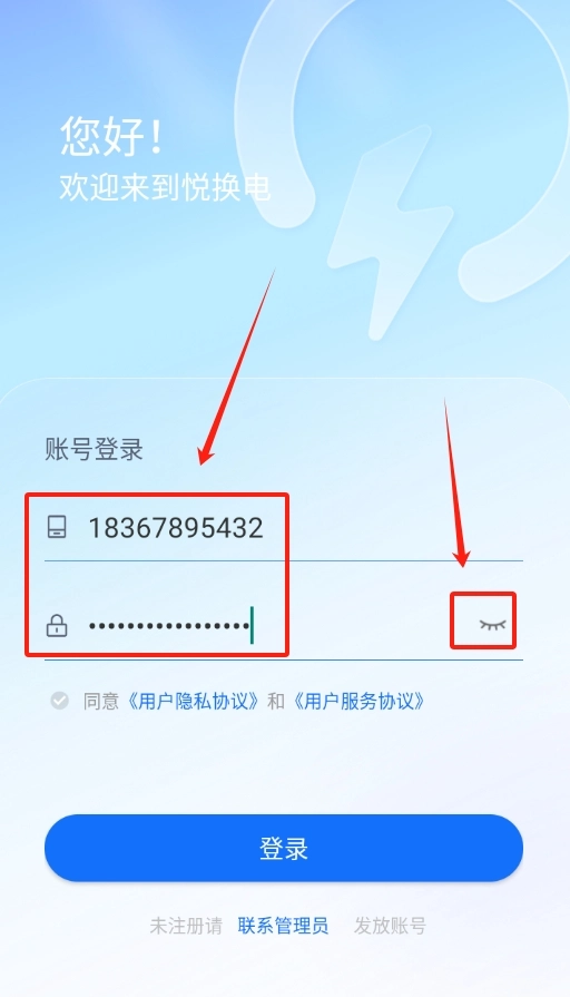 1、打开悦换电软件,在登录界面找到手机号输入框,填入常用号码,再输入对应的密码。