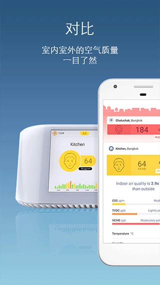 2、和你的空气质量监测器相连,查看室内空气质量状况,将其与室外情况进行对比,进而选择合适的防护措施。