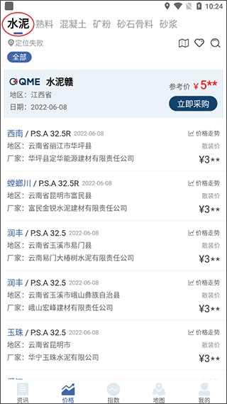 2、点击价格选项后,会显示混凝土、水泥、矿粉等不同地区的价格信息,接着选择“水泥”对应的价格栏。