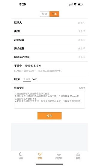 3.提供帮帮系统,有任何需要的话都可以在帮帮上下单,无论是代拿快递,还是想让同学去食堂买饭,这里都可以下单;