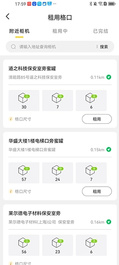 3、还可以查看附近的格子柜机,根据自身需求,直接点击租用进入租用流程,按照提示操作就能成功租用。