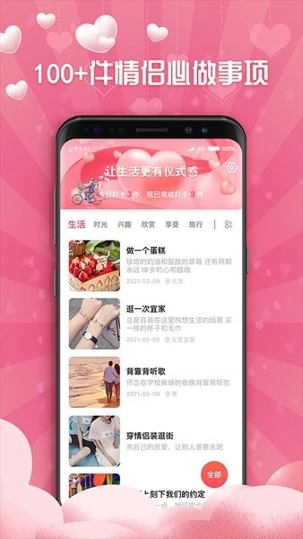“恋爱进行时”是专为热恋情侣打造的待办清单,丰富恋爱事件,为日常恋爱时光增添甜蜜小确幸~