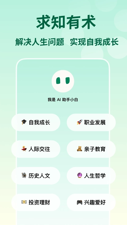 问小白革新创作方式,助您轻松驾驭文字世界。另外,我还能基于你的困惑,为你量身生成AI内容,帮助你更好地解决生活问题。我们的目标是帮助用户成为更好的人,让每个人都能在快节奏的现代生活中找到平衡,高效地解决面对的挑战。希望能成为你的得力助手。