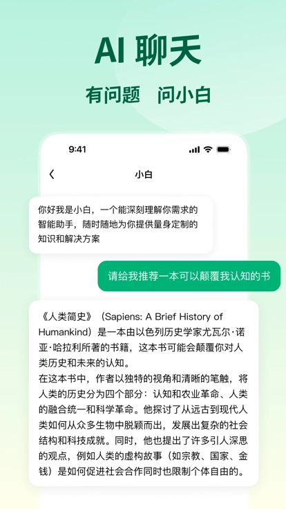 问小白是一款好用的AI智能助手软件,能帮助大家轻松创作。它拥有丰富的功能,大家可以借助这款软件进行创作,它能为大家智能生成文案,还能为更多朋友提供提问服务,是一款非常智能的软件。